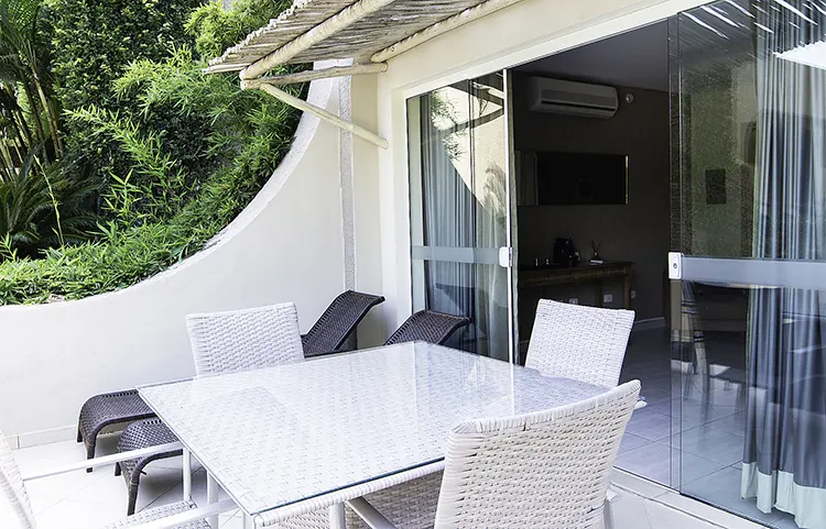 Ar condicionado split | Varanda com mesa, cadeira e chaise longue‎ | Mini Bar |